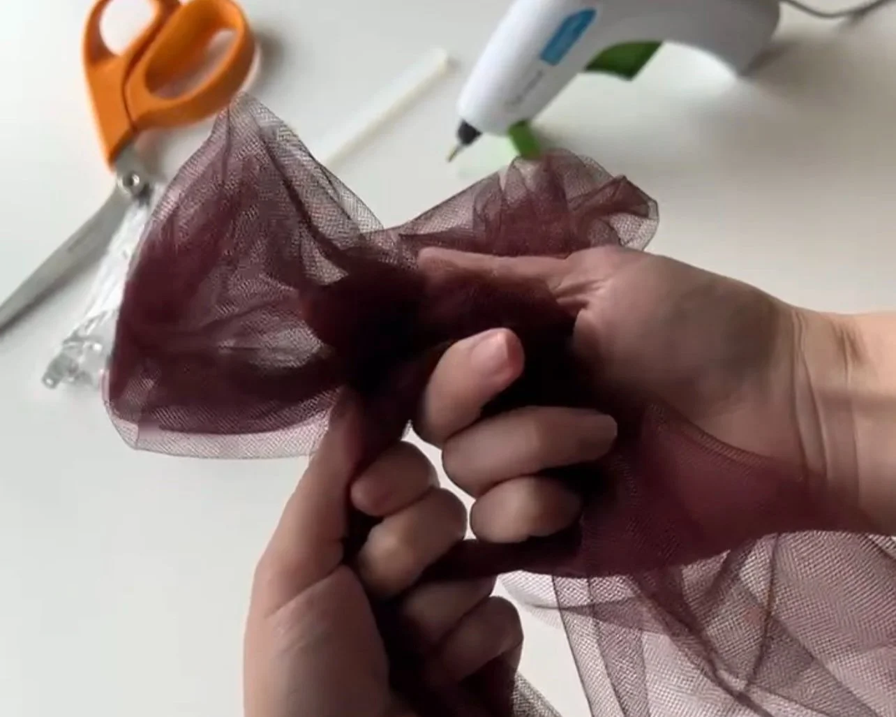 Holding the tulle in one hand so the knot is at the top and the rest is underneath.